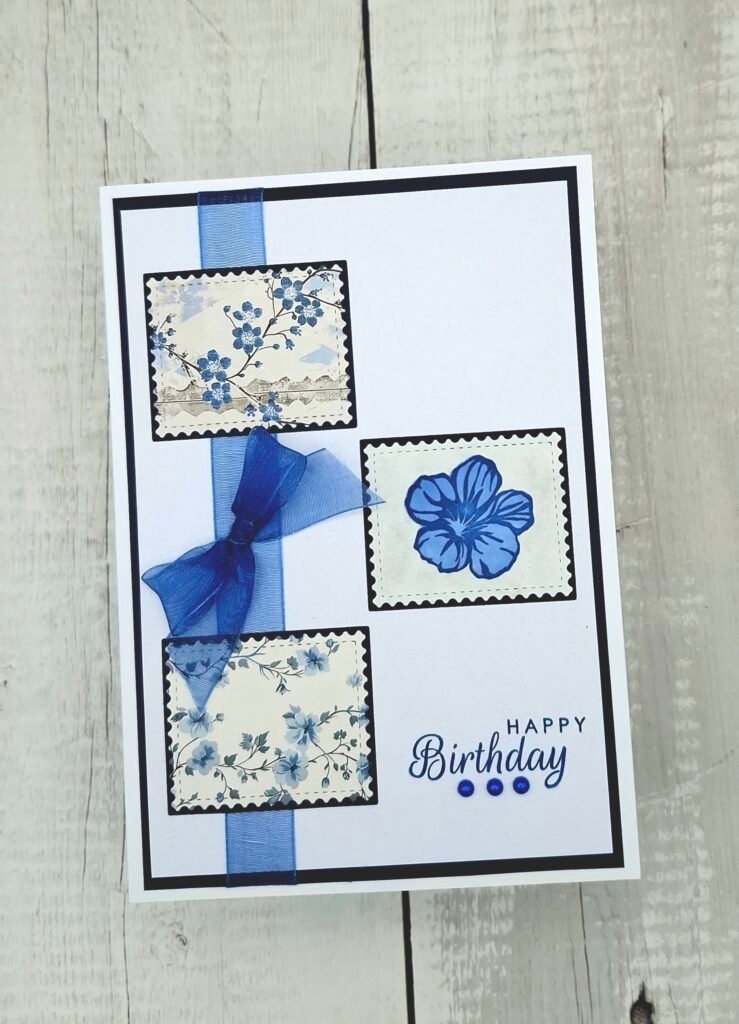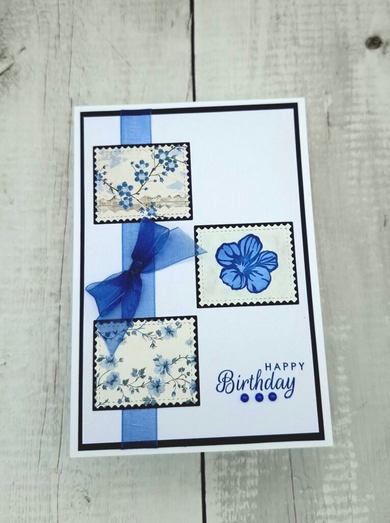 I used two layers of cardstock. First one is dark blue and the second is white and a little bit textured. The blue rectangles and postage die cuts are from Gina K. Designs Master Layout 15 die set. The pattern paper is just some no name paper that I had in my stash. The blue flower is stamped with Tropical Flowers stamp set from Simply Made Crafts. To stamp it, and also a sentiment, I used Archival ink pads from Ranger: Cobalt and Periwinkle.