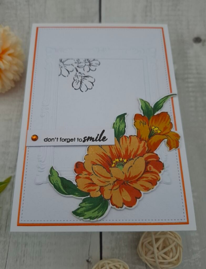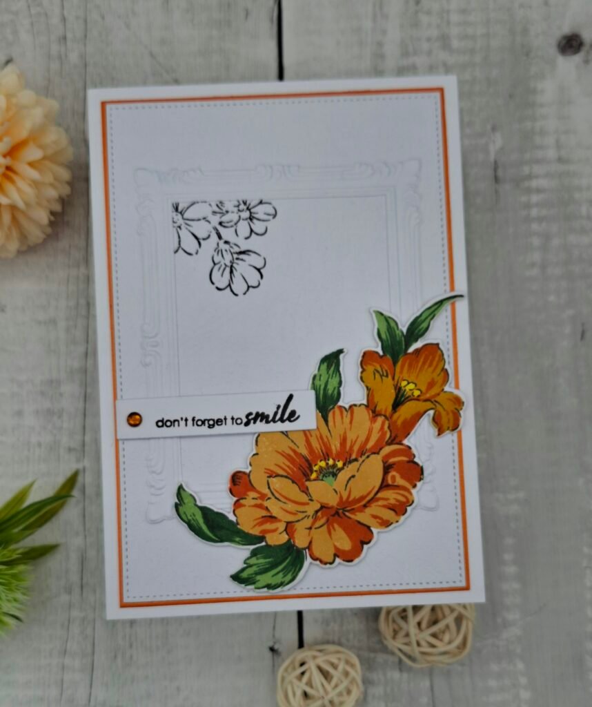 I also used an embossing folder Simple Frame 3D from Altenew. I cut out the frame just to give it some interest. The sentiment is from Golden Days stamp set and the flowers are from Simple Beauty stamp set. Both from Altenew.